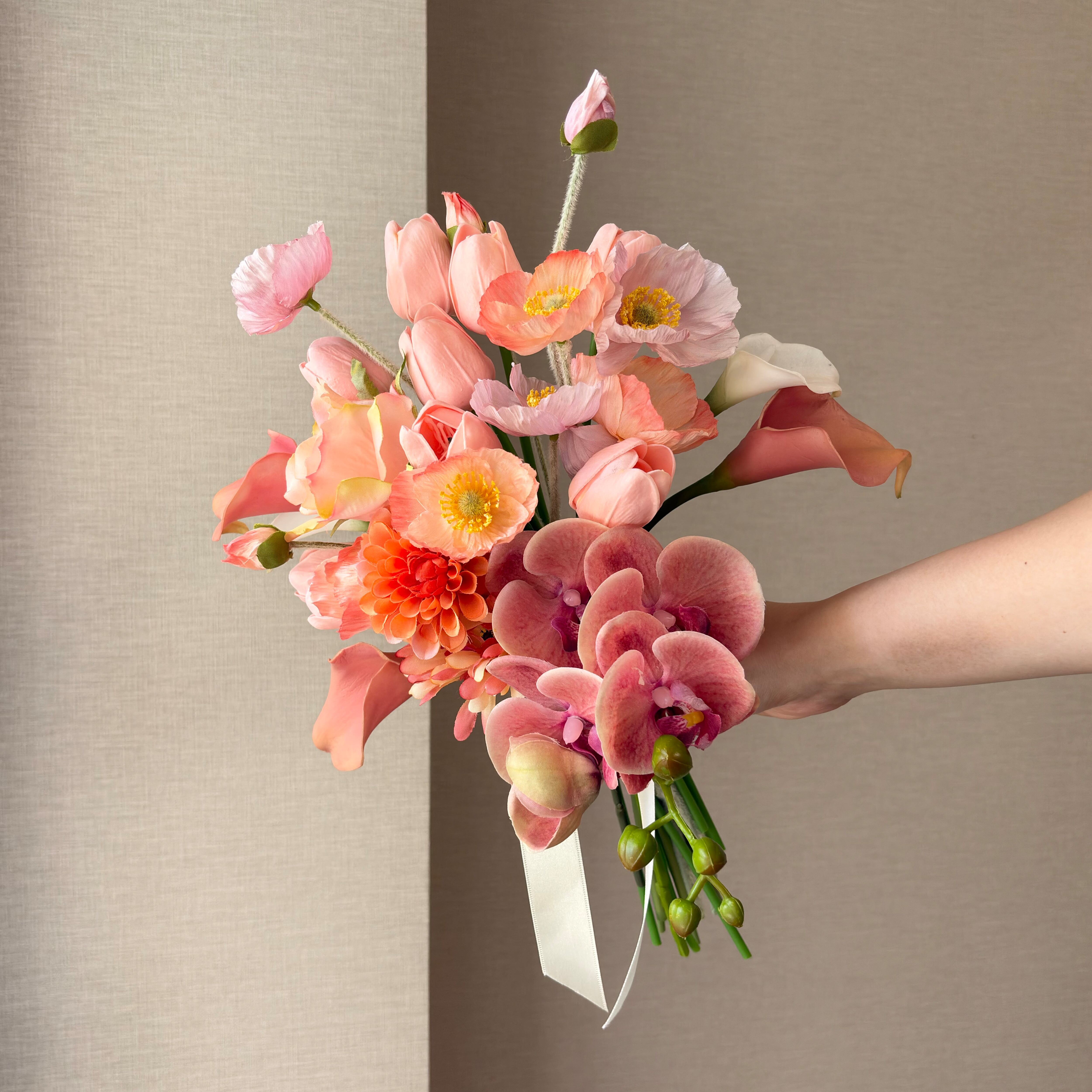 こちらのブーケは暖かい色味で作成したく、オレンジやピンク、赤などの暖色系を集めて作成いたしました♩