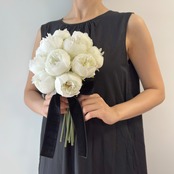 【ブートニア付】黒ベルベットリボンで高級感|清楚白のウェディングブーケ|アーティシャルフラワー造花