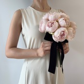 【ブートニア付】黒ベルベットリボンで上品に|ピンク薔薇のウェディングブーケ|アーティシャルフラワー造花