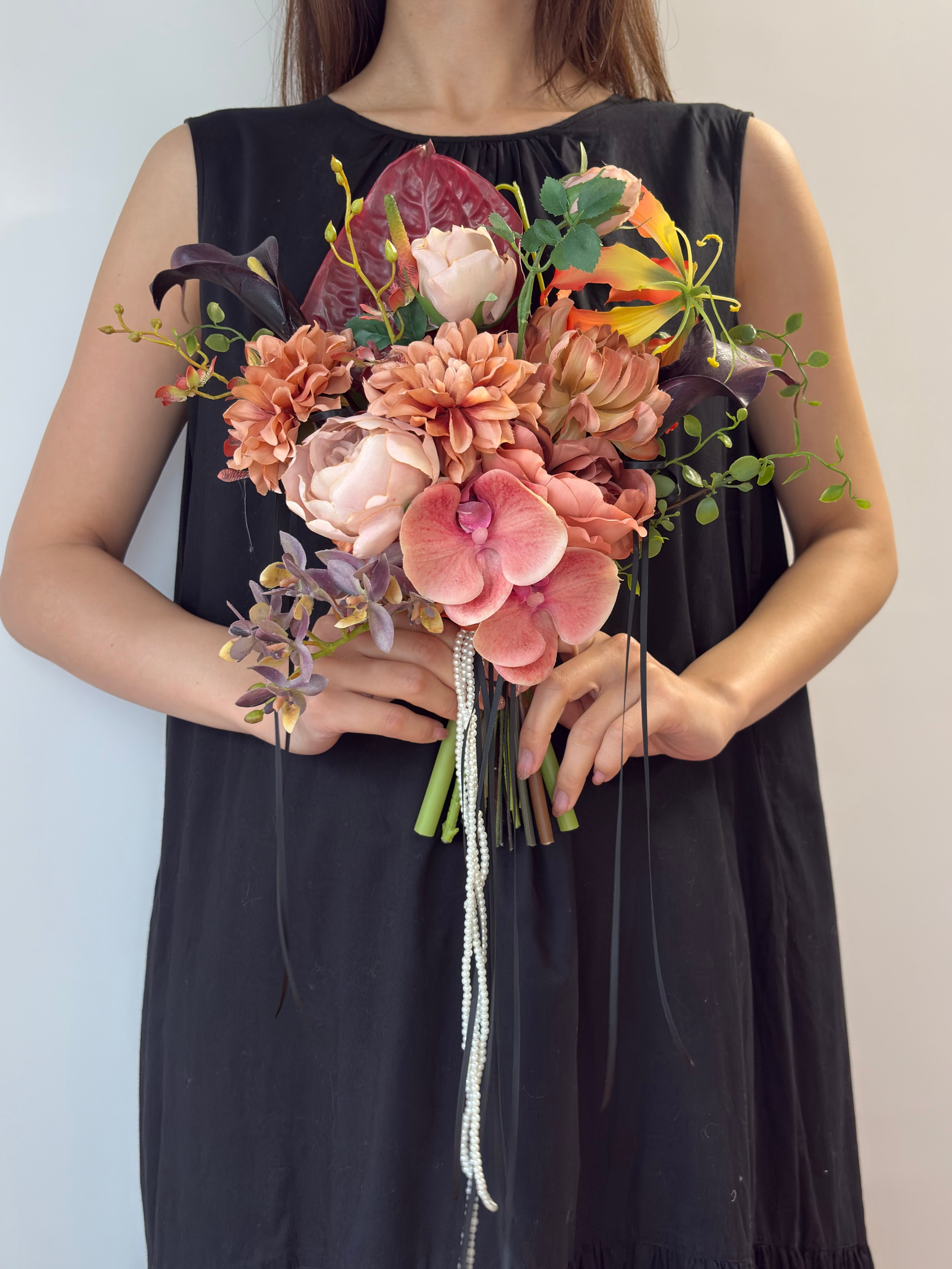 【ブートニア付】オレンジ×パープルのパールブーケ | ウェディングブーケ