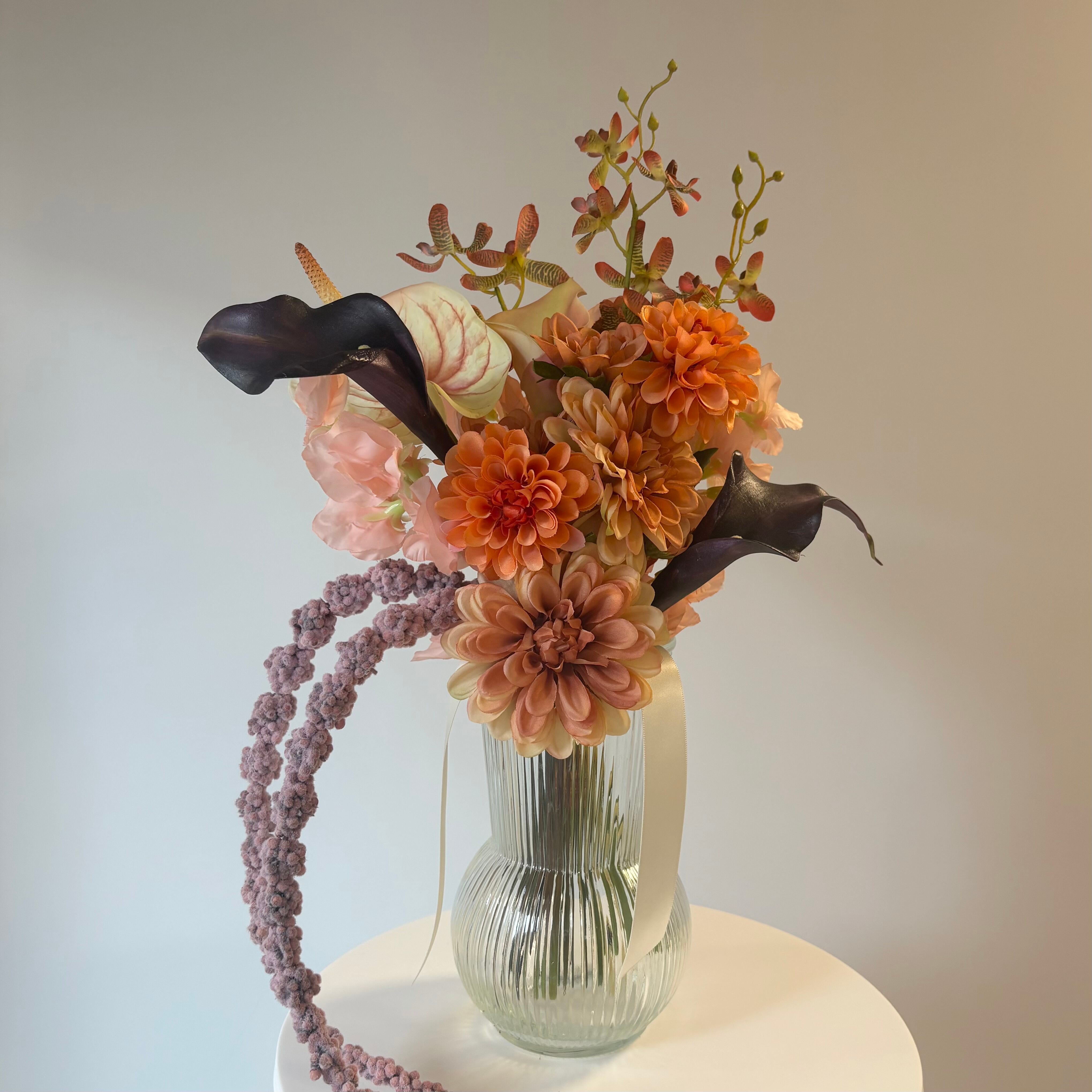 〇配送中により、お花の向きが変わったり、多少お花の表面が潰れる場合があるかと思います。造花は針金が入っており、ご自身での調整が可能です。その時にはお手直しをお願いいたします。