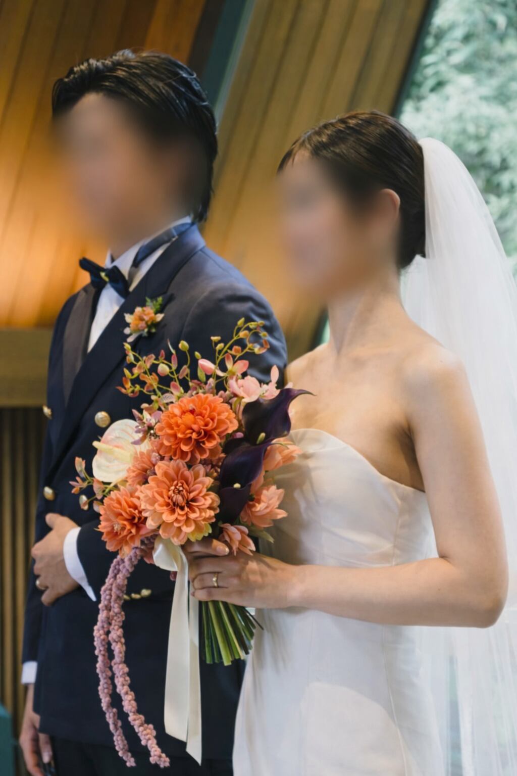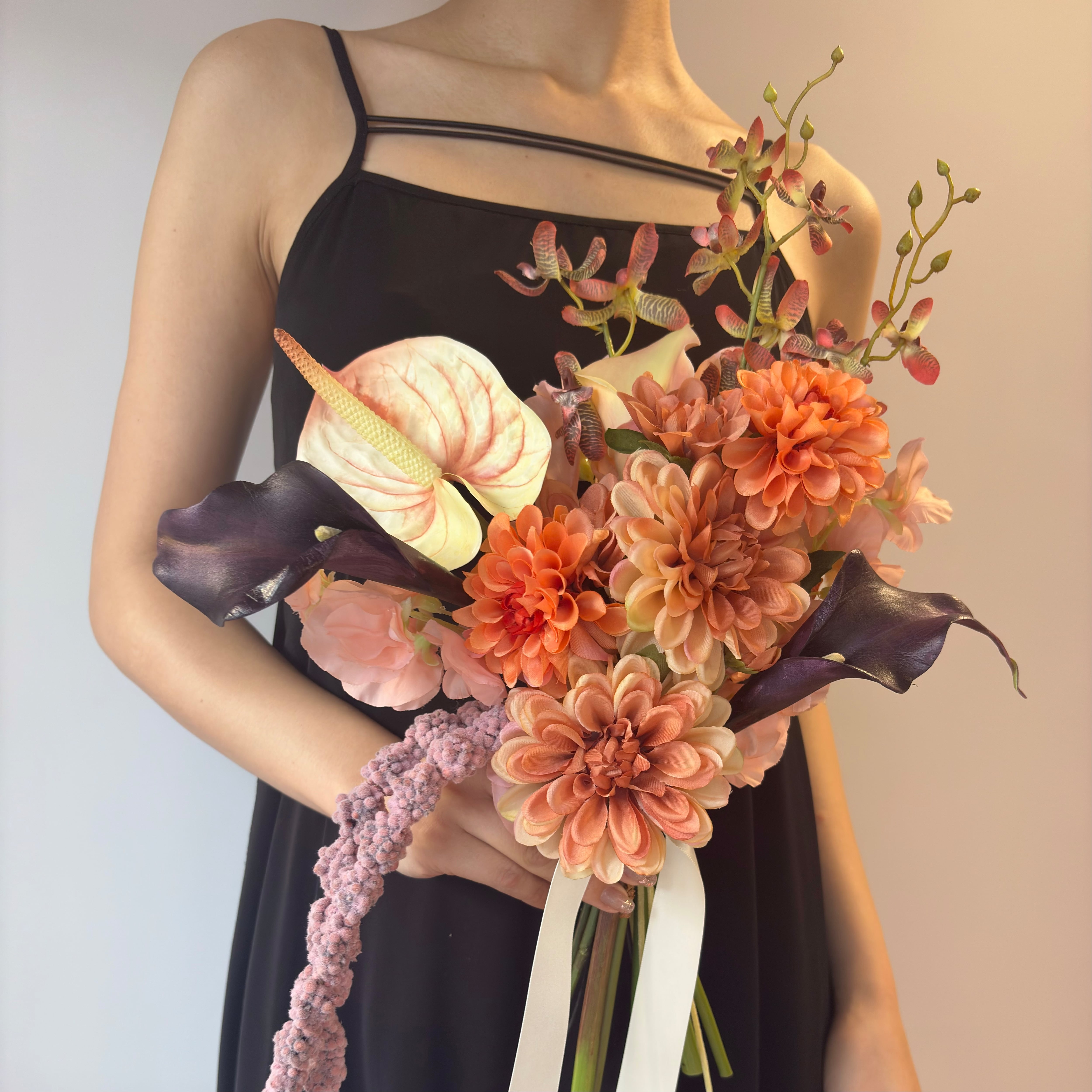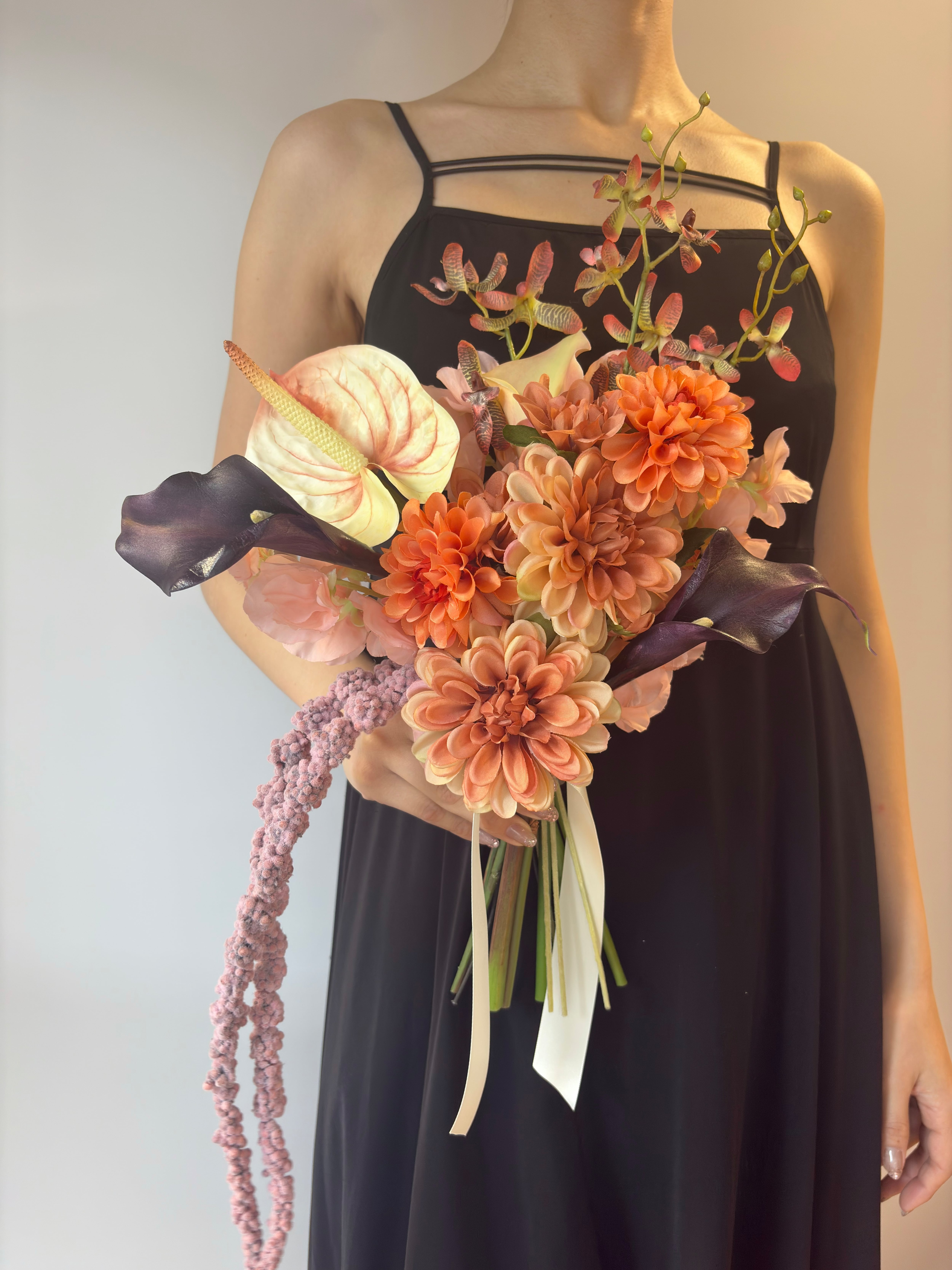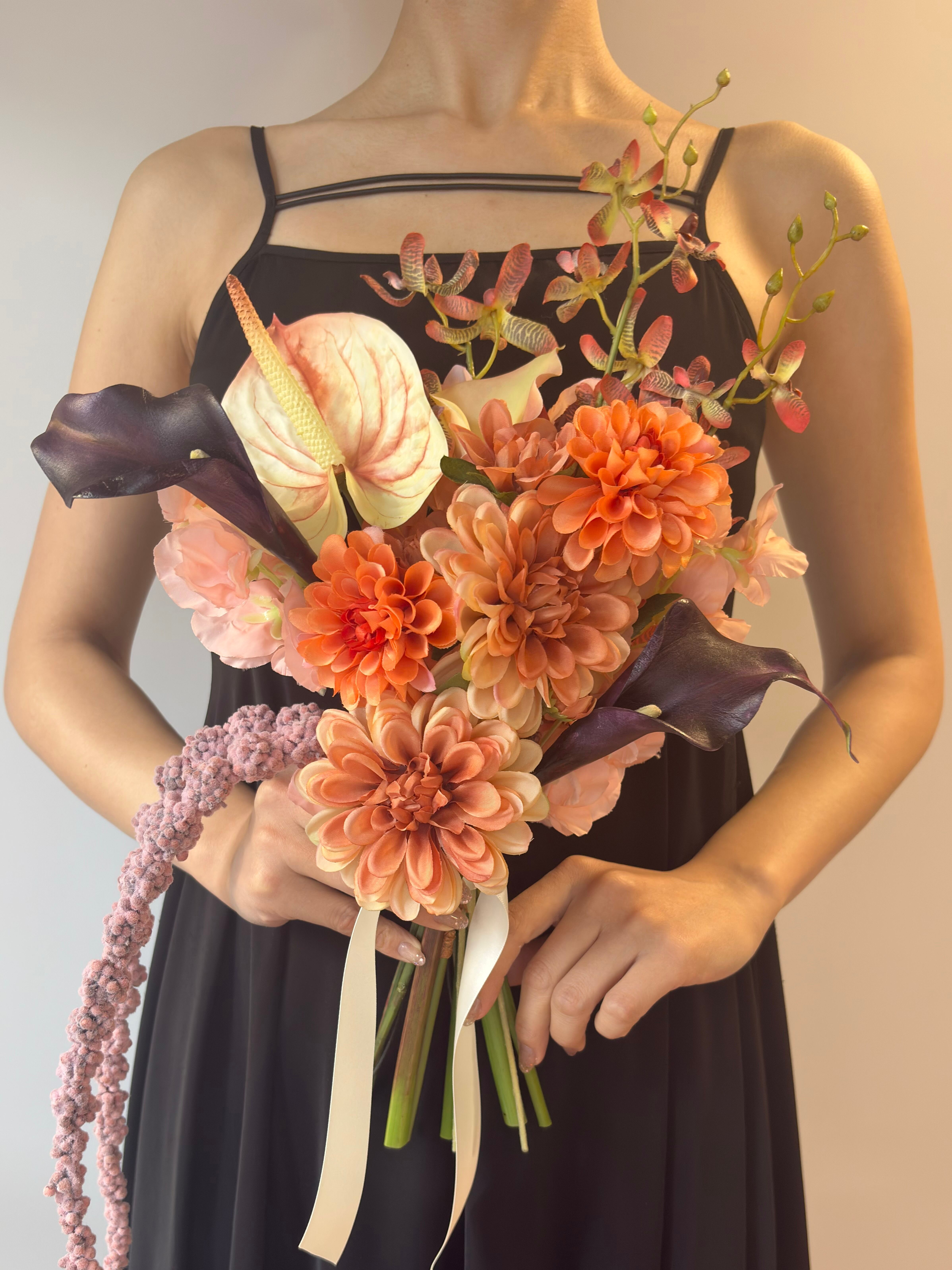 【ブートニア付】オレンジ×パープルのウェディングブーケ|アーティシャルフラワー造花