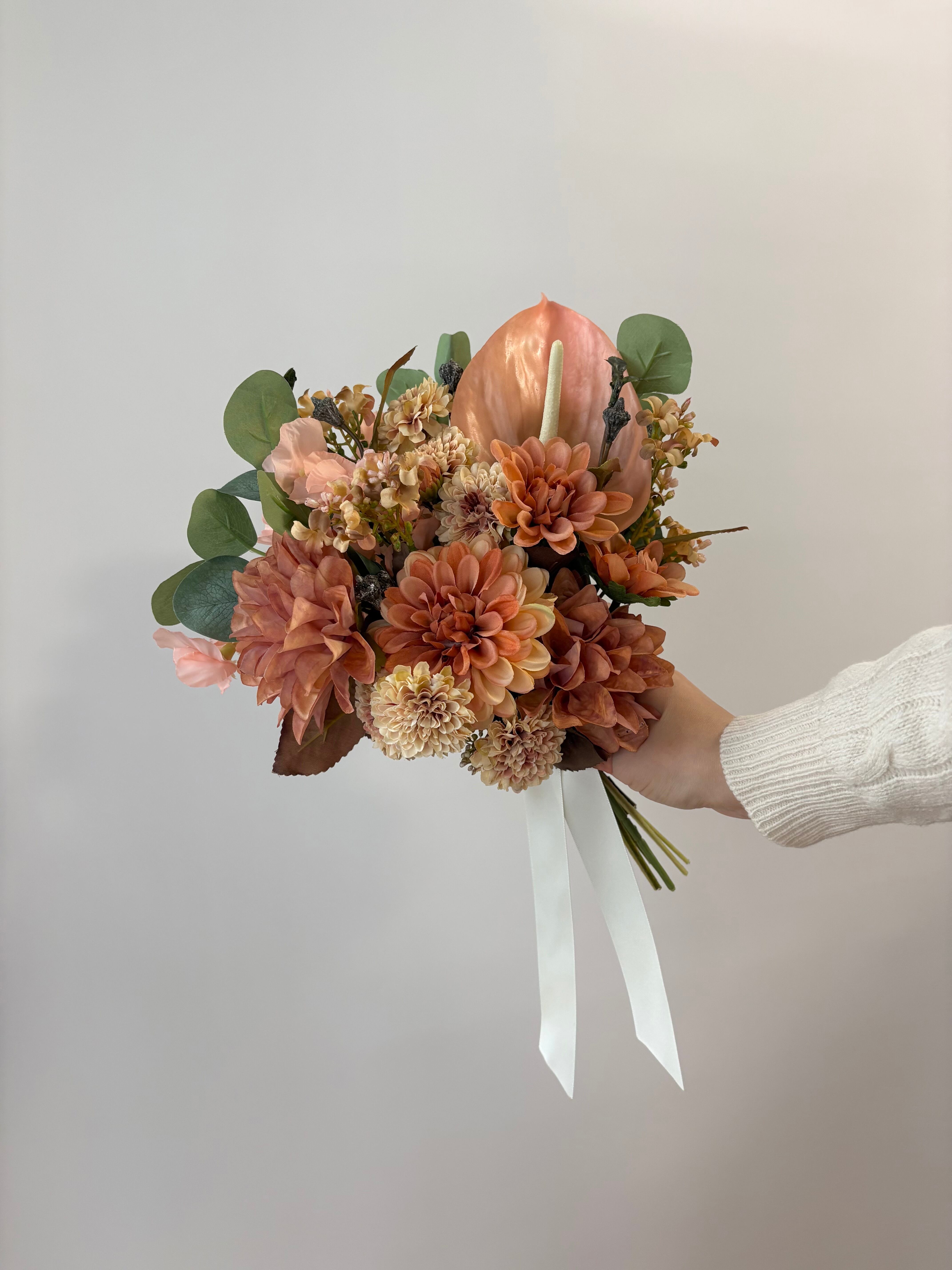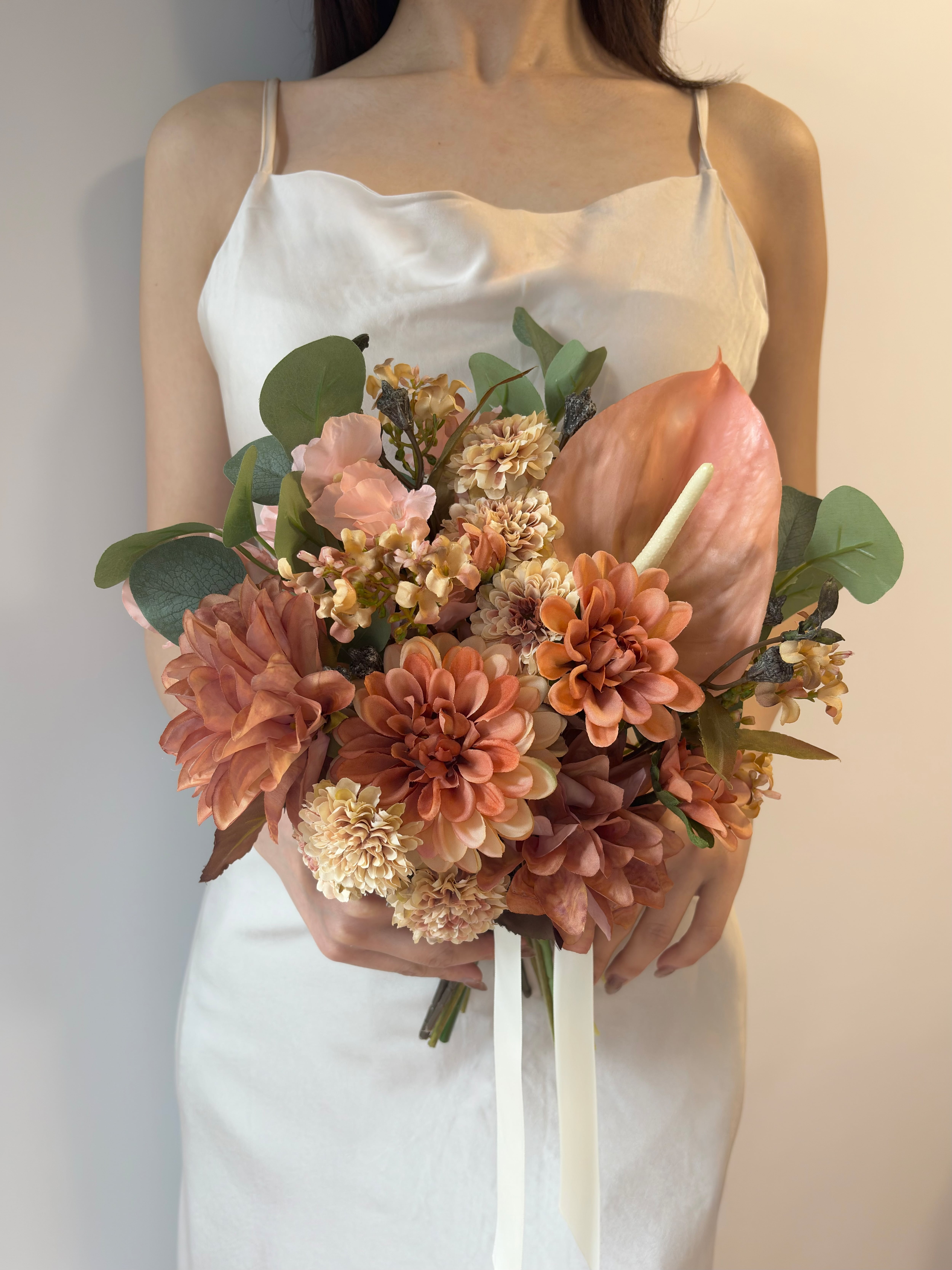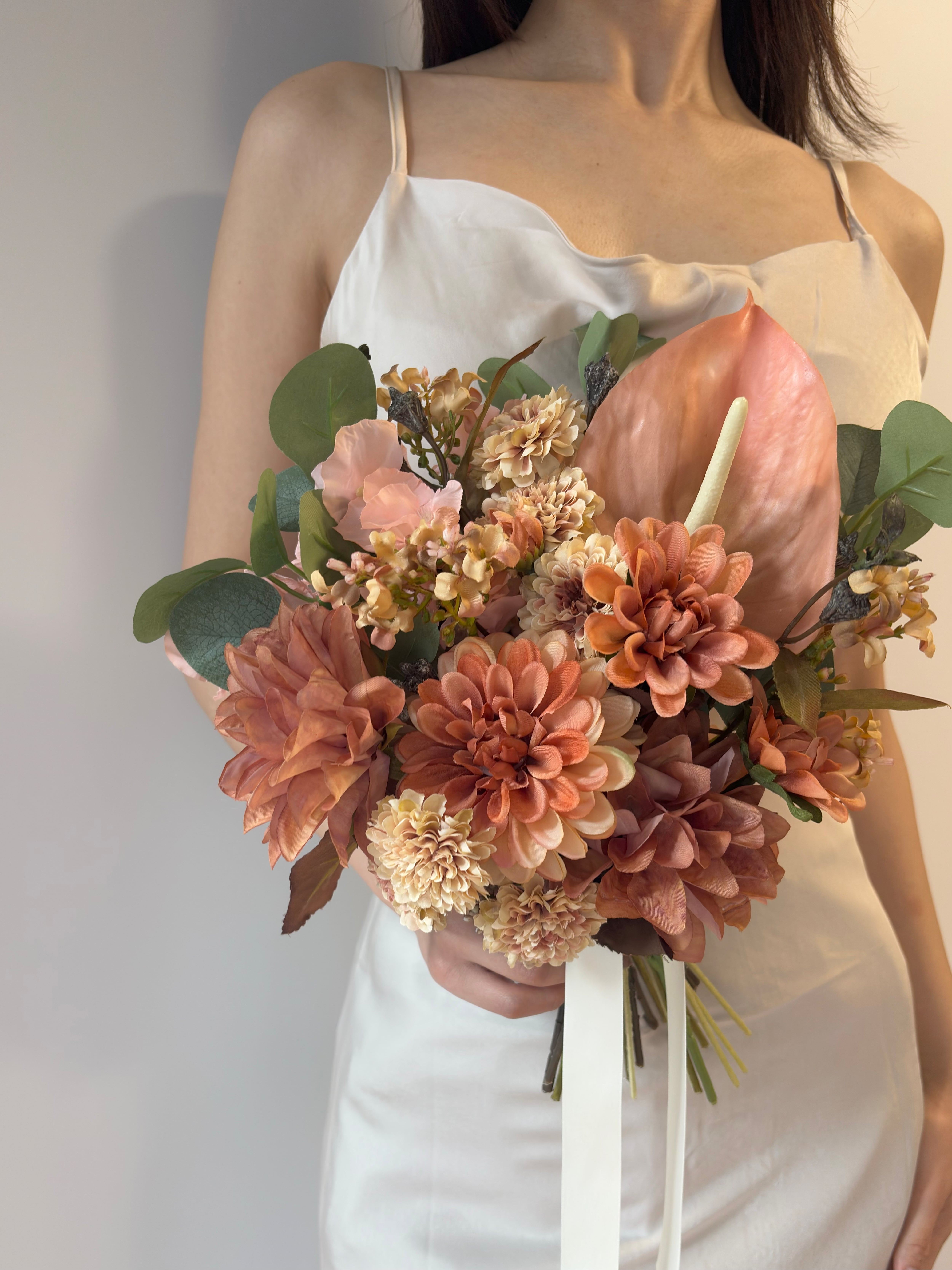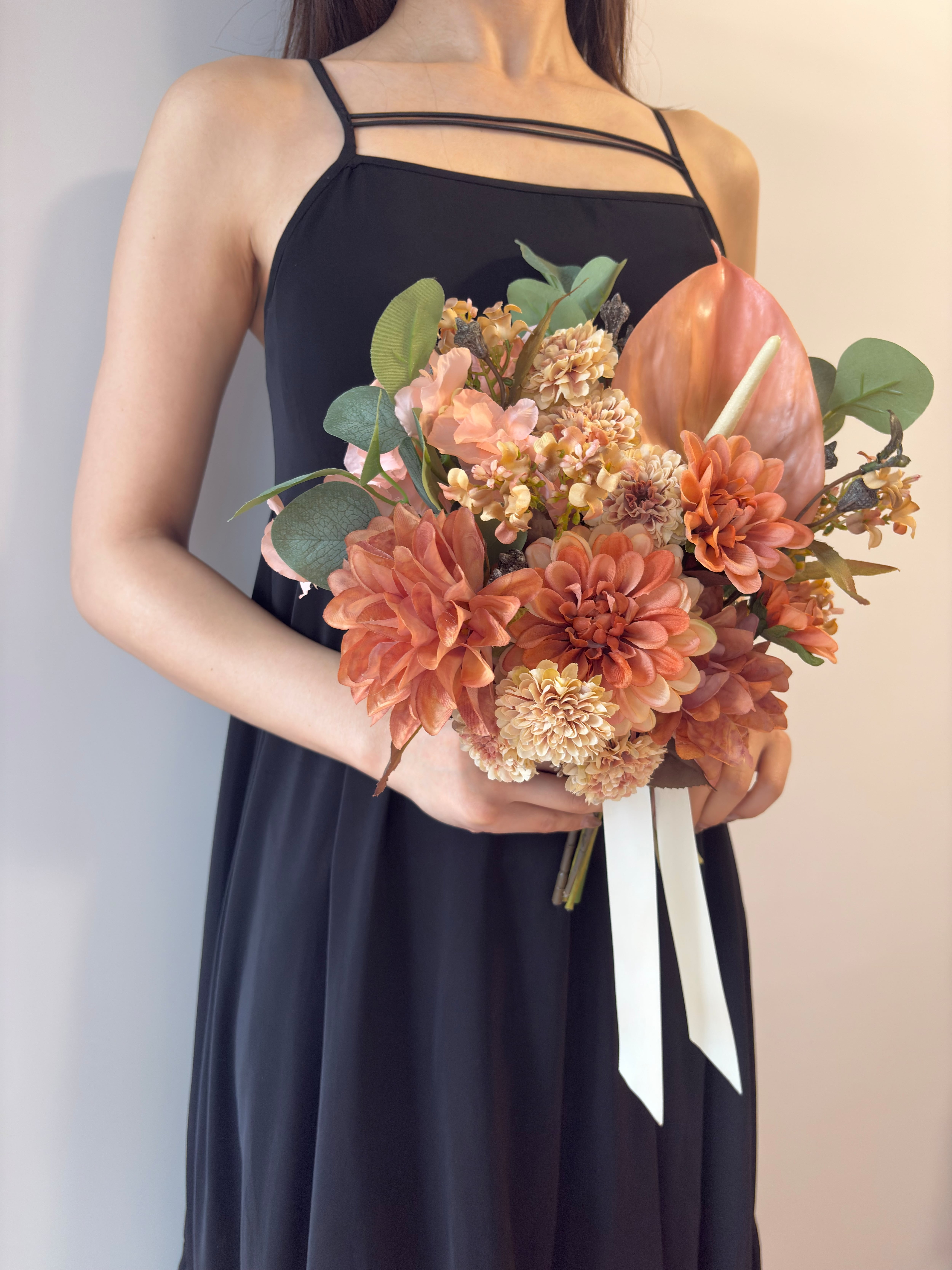 【ブートニア付】テラコッタ×くすみブラウンのアンティークブーケ(造花)|結婚式・卒業式にも